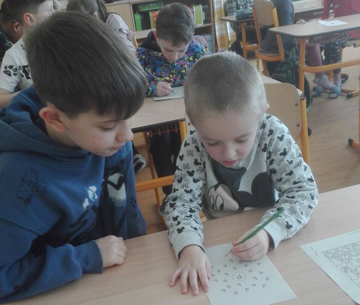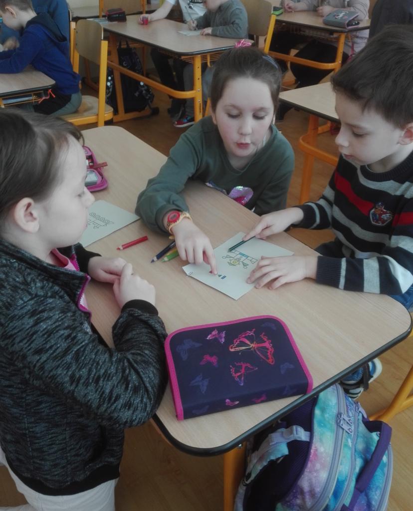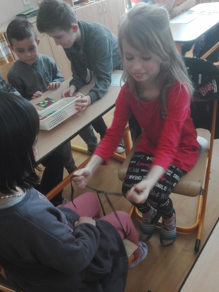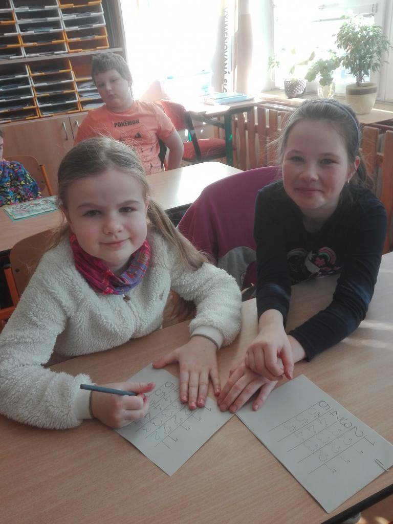 Do 3. B zamířily děti z „Třešňovky“. Po společném zpěvu na uvítanou spadla ze všech tréma a napětí. Předškoláčky si přebrali zkušení třeťáci a pod jejich vedením si procvičovali poznávání geometrických tvarů, počítání teček, vybarvování, skládání kostek podle předlohy, ale i zavazování tkaniček nebo rozlišování tvarů.